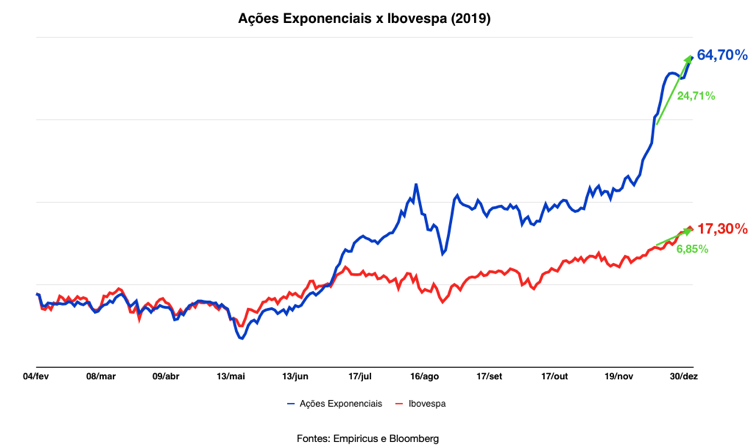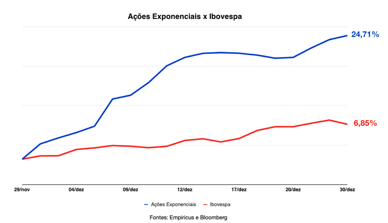 E, dezembro, mês de performance absurdamente positiva das ações brasileiras, a lista restrita das ações exponenciais mais do que TRIPLICOU o desempenho do Ibovespa.