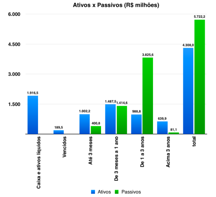 Enquanto o passivo do Banco, ou seja, os seus próprios compromissos, a captação do banco (aquele CDB que você compra na sua corretora), é de longo prazo.