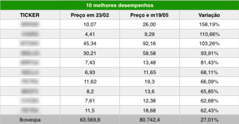 Desde a mínima da crise atual, que foi no dia 23 de março quando a Bolsa bateu 63 mil pontos, as 2 maiores altas do Ibovespa inteiro foram de ações que estavam nesta Lista: