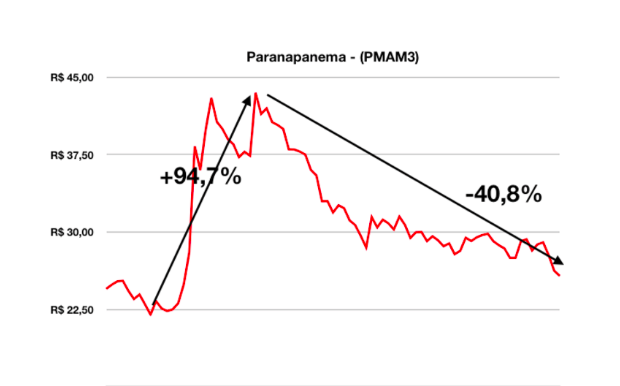 Porém, quem apenas comprou a ação, e não seguiu as publicações de acompanhamento, viu a ação despencar - 40% após nossa recomendação de venda.