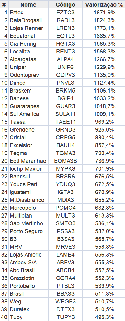 Somente com a última ação deste ranking, você teria multiplicado seu capital investido por praticamente 6 vezes.