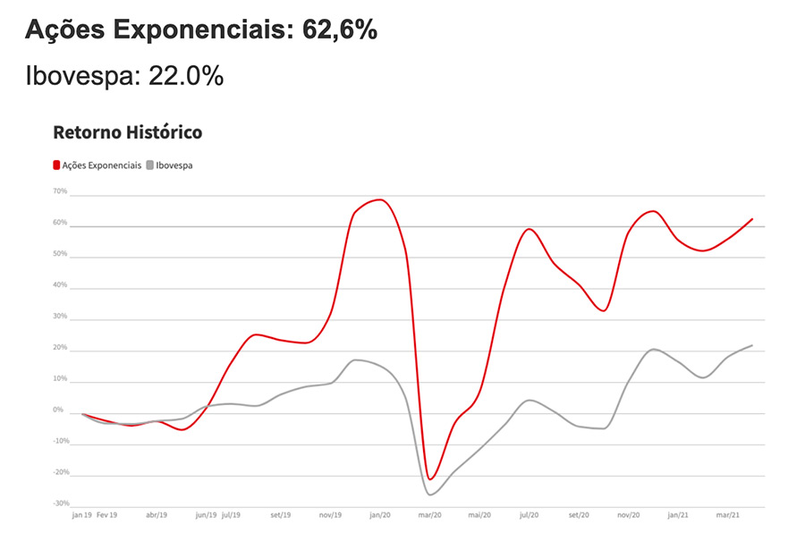 Sem considerar um momentum de reviravolta pós-crise como este, note que o desempenho médio da lista de Ações Exponenciais até aqui apresenta rentabilidade equivalente ao TRIPLO do Ibovespa.
