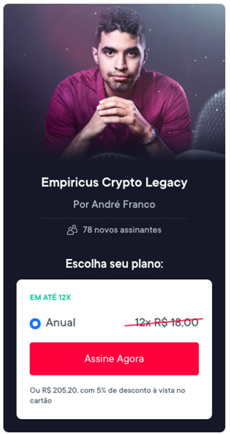 Mas, entrando hoje, nesta campanha em parceria com o Mercado Bitcoin, o custo da assinatura será de…
