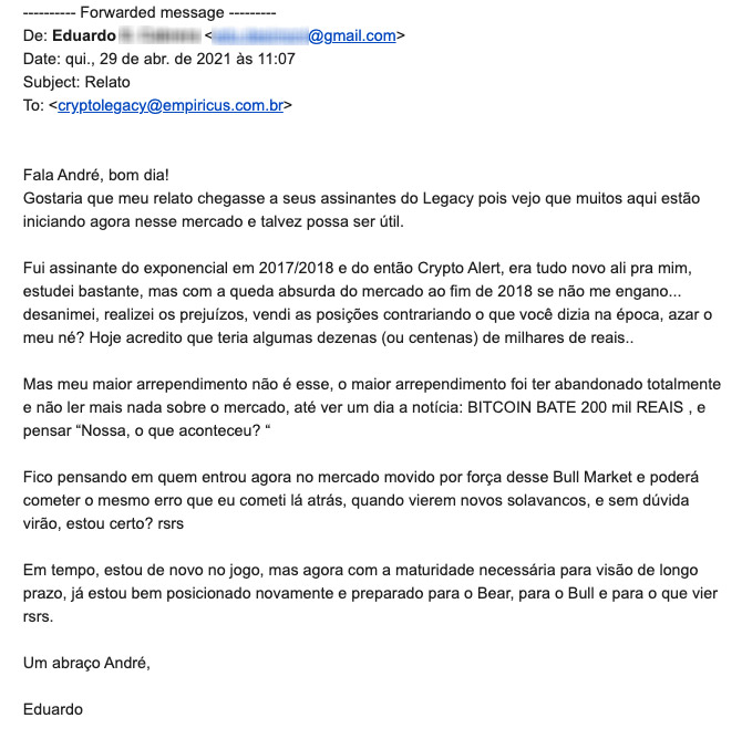 "Eu conheci o Bitcoin em 2016 através do meu irmão. Mas com muitas dúvidas eu tive muito receio de começar. Só em 2018, com o incentivo da minha mãe, que por sinal tinha mais medo do que eu, coloquei ali o primeiro pezinho na água (...)
