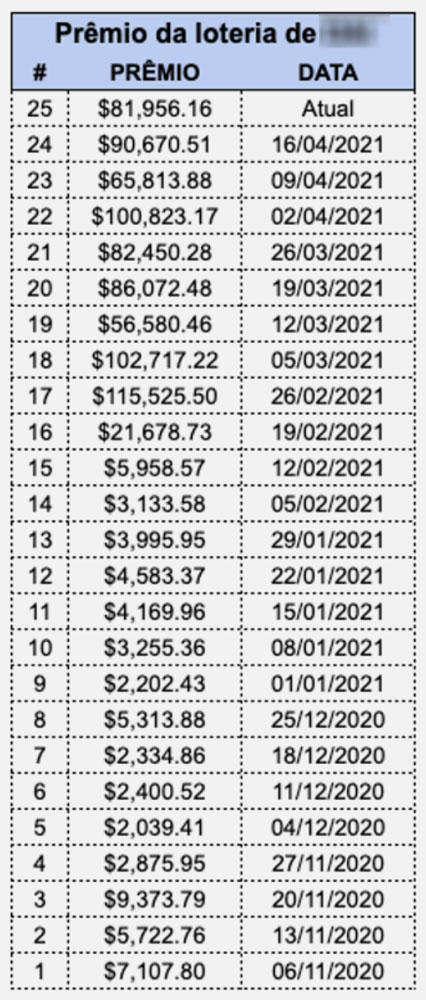 O sorteio mais antigo teve a sua primeira premiação realizada em 30 de outubro de 2020, num total de US$ 7.107,80.