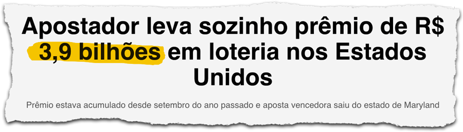 Digo isso porque o maior prêmio pago por uma loteria foi de US$ 1,58 bilhão em 2016, no sorteio do Powerball.