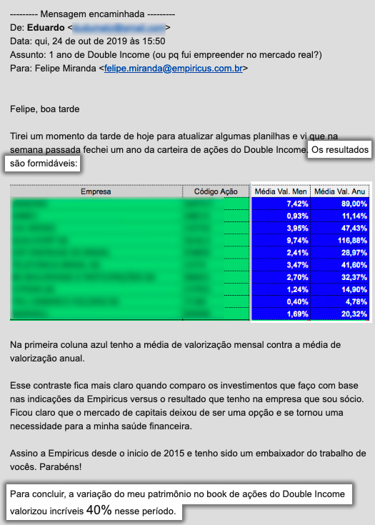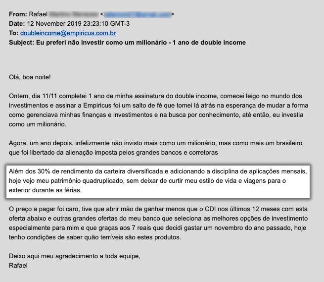 E o que me motiva a bater recorde atrás de recorde na Empiricus é saber que, por trás daquela receita e daquele número de assinantes, há um significado concreto: existe uma quantidade maior de famílias sendo educadas financeiramente, recebendo indicações de investimentos sem conflito de interesses, e que vão usar o dinheiro de suas aplicações financeiras para realizar seus sonhos e para superar percalços que virão pelo caminho.