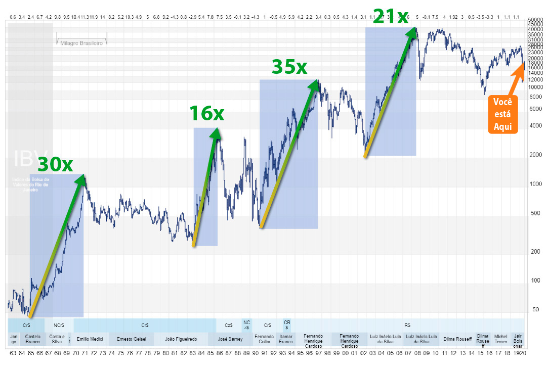 Os últimos 4 grandes ciclos da Bolsa duraram entre 6 e 8 anos e entregaram multiplicações médias, ou seja, somente do Ibovespa, entre 16 e 35 vezes em dólar.