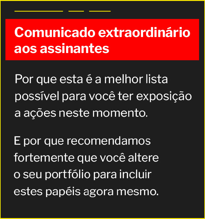 Atenção: a Empiricus prioriza a preocupação com a saúde de seus assinantes, leitores, colaboradores e familiares. Fique em casa e proteja sua família. Paralelamente, também é importante pensar em proteger o patrimônio da sua família, dado o impacto que economias, empregos e mercados estão sofrendo. E isso pode ser feito da sua casa, pelo celular ou computador. Esse é o motivo da oportunidade que trazemos hoje para você.