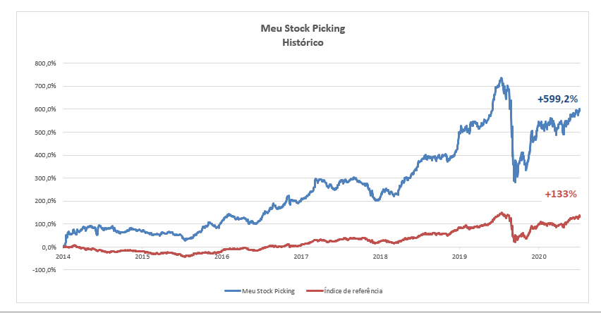 Para você ter uma ideia mais clara de como o dedo do analista faz toda a diferença, dá uma olhada na comparação do stock picking do Max Bohm (linha azul) contra o Ibovespa (linha vermelha):