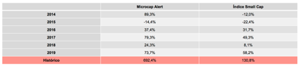 Desde seu início, a carteira teórica divulgada na publicação Microcap Alert tem rendido 694% contra 142,2% do índice Small-Caps, principal benchmark.