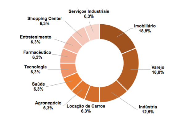 Temos nessa carteira uma gama bem variada de setores: são empresas de shopping centers (um jeito inteligente de estar exposto ao varejo), da indústria, do entretenimento, do setor imobiliário (temos consultoria imobiliária, galpões logísticos e lajes corporativas) além de logística, setor agrícola e claro, tecnologia.