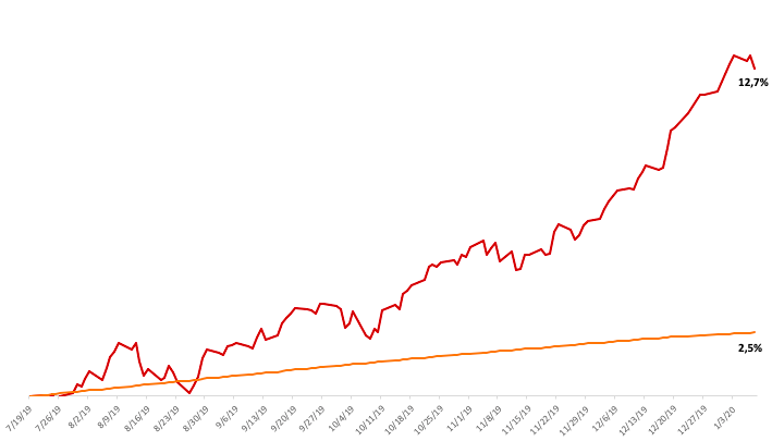 A linha vermelha é o retorno da carteira de investimentos sugerida por mim no segundo semestre de 2019.
