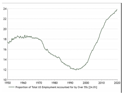 A participação das pessoas com mais de 55 anos na força de trabalho nos EUA subiu de 12% em 1990, para 24% em 2020.