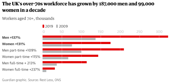 Num estudo divulgado pelo The Guardian - maior jornal inglês - a população com mais de 70 anos ativa no mercado de trabalho subiu, nos últimos 10 anos: