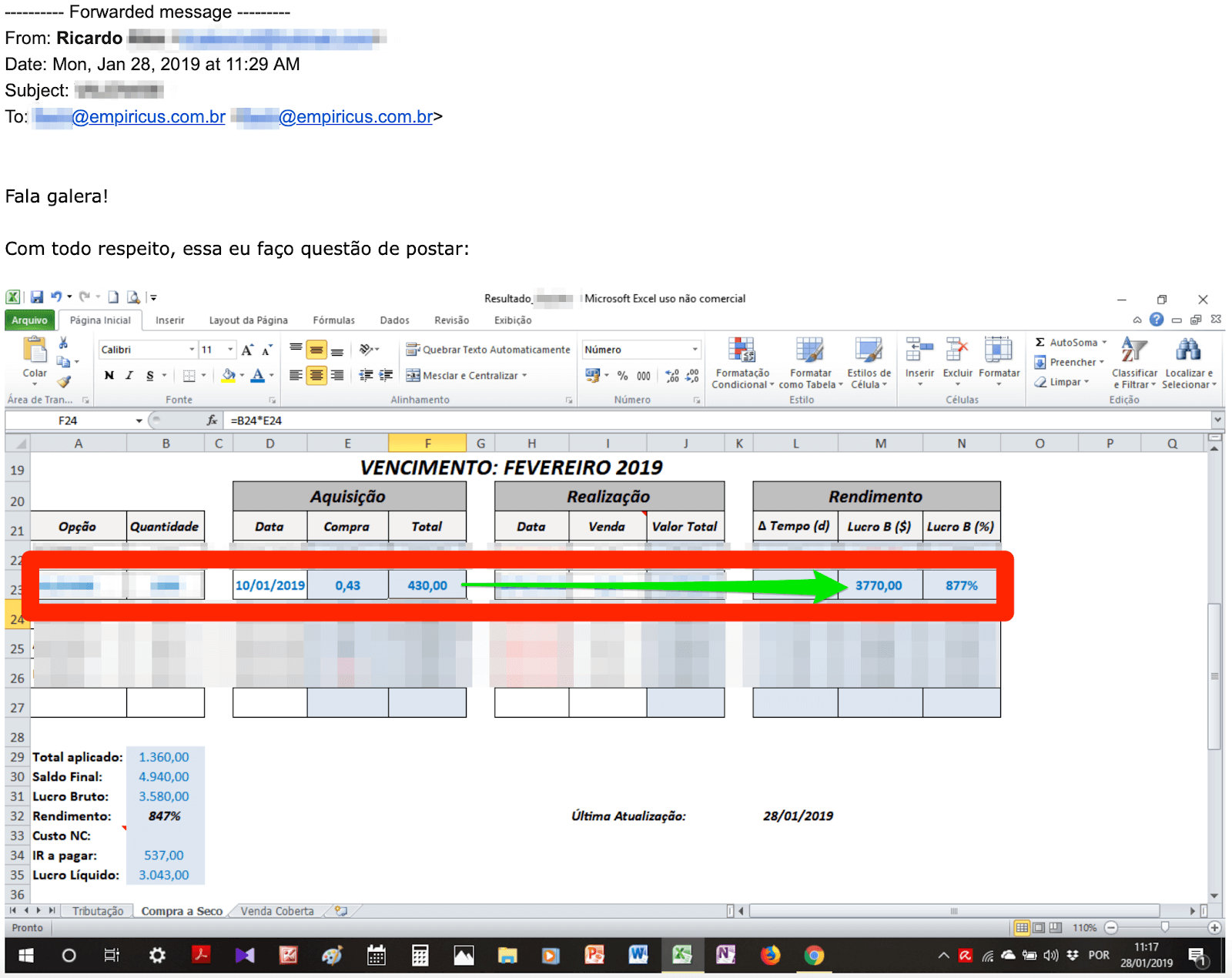 E em 18 dias ganhou R$ 3.770… total de 877% de lucro.
