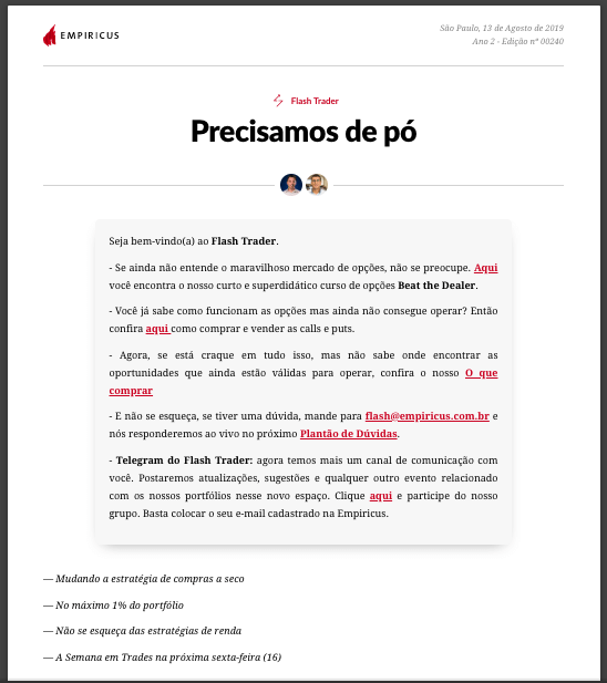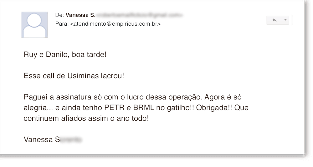Os conteúdos da Empiricus visam informar sobre possibilidades de lucro financeiro sugeridas na forma de diferentes estratégias de investimento, eximindo-se a empresa de qualquer responsabilidade sobre eventuais prejuízos do assinante em decorrência da tomada de decisão deste. Embora a Empiricus forneça sugestões pontuais de investimento, fundamentadas pela avaliação criteriosa de especialistas certificados, não se pode antecipar o comportamento dos mercados com exatidão. Padrões, histórico e análise de retornos passados não garantem rentabilidade futura. Todo investimento financeiro, em maior ou menor grau, embute riscos que podem ser mitigados mas não eliminados. A Empiricus alerta para que nunca sejam alocados em renda variável aqueles recursos destinados a despesas imediatas ou de emergência, bem como valores que comprometam o patrimônio do assinante. A empresa não realiza intermediações financeiras, por conseguinte não obtém nenhum tipo de receita advinda de comissões, corretagens ou emolumentos sobre montantes aplicados, delegando ao investidor a exclusiva responsabilidade pela execução de operações junto à respectiva instituição financeira na qual possua conta aberta. Para assegurar a imparcialidade na avaliação dos investimentos, a Empiricus não recebe patrocínios nem veicula publicidade que não a de seus próprios conteúdos. Pessoas que têm dificuldades com limites devem procurar aplicações mais estáveis, como a renda fixa. A título de elevação dos padrões fiduciários e promoção das melhores práticas do mercado, os sócios da Empiricus têm, ou podem vir a ter, posições nos investimentos sugeridos. A empresa zela pelo direito de privacidade dos seus leitores. Quando necessário, seus dados pessoais são alterados com o objetivo de proteger as identidades. No entanto, o conteúdo dos depoimentos apresentados é sempre e garantidamente fidedigno. A presente nota não se sobrepõe à legislação e regulamentação vigentes.