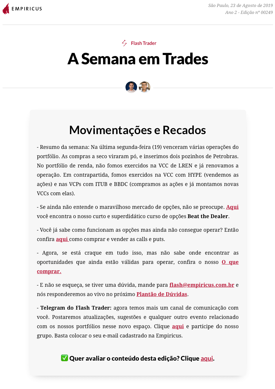 # A Semana em Trades – publicação divulgada todas as sextas-feiras, sempre à tarde. Ela traz um acompanhamento de todas as operações sugeridas, além de um resumo dos assuntos mais quentes e que mexeram com o mercado na semana.