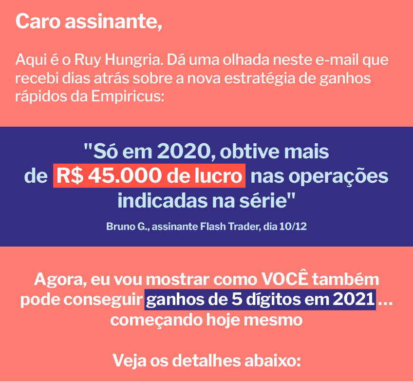 A partir de agora, você está convidado a experimentar a mais vencedora estratégia de ganhos rápidos da Empiricus, capaz de gerar lucro na casa dos 5 dígitos.