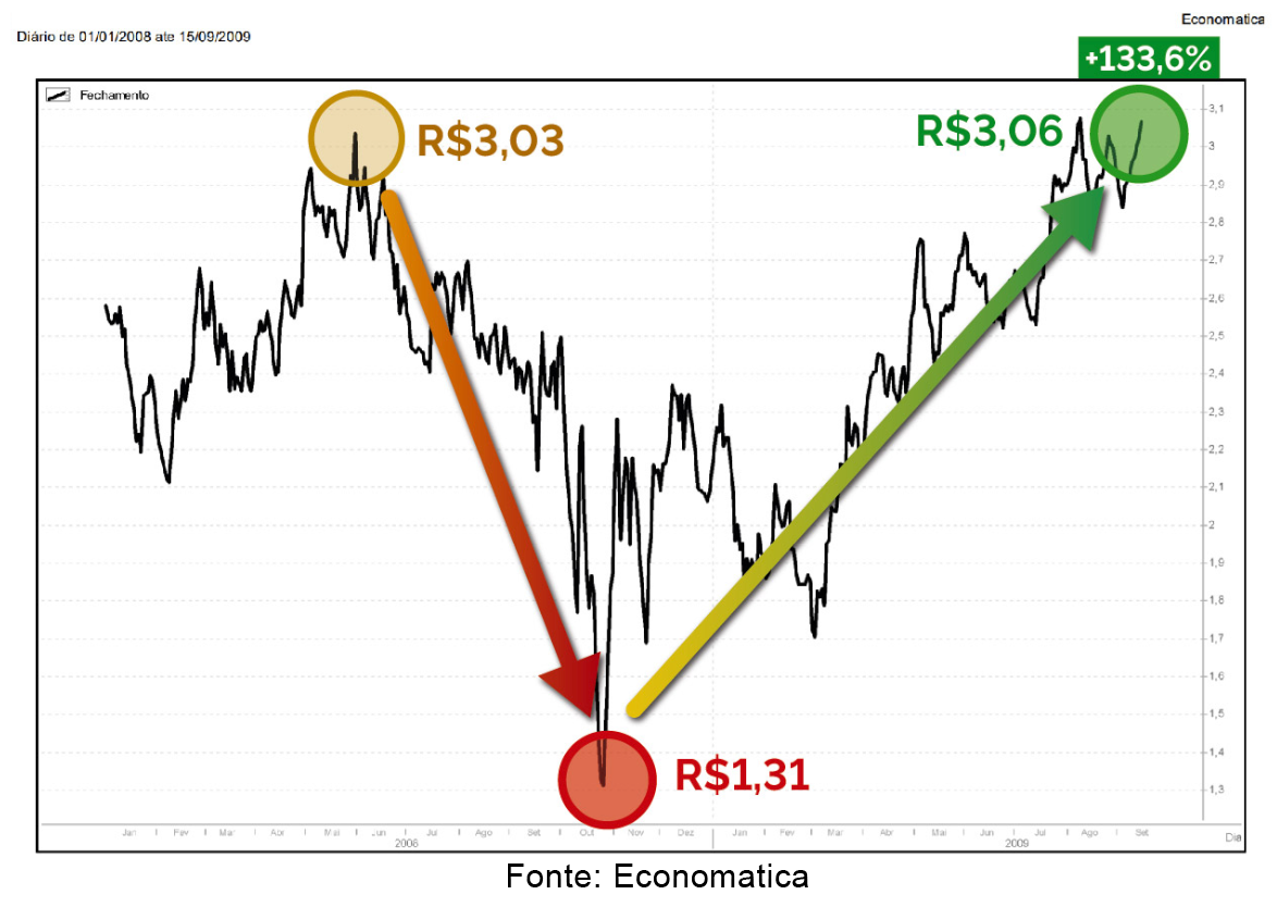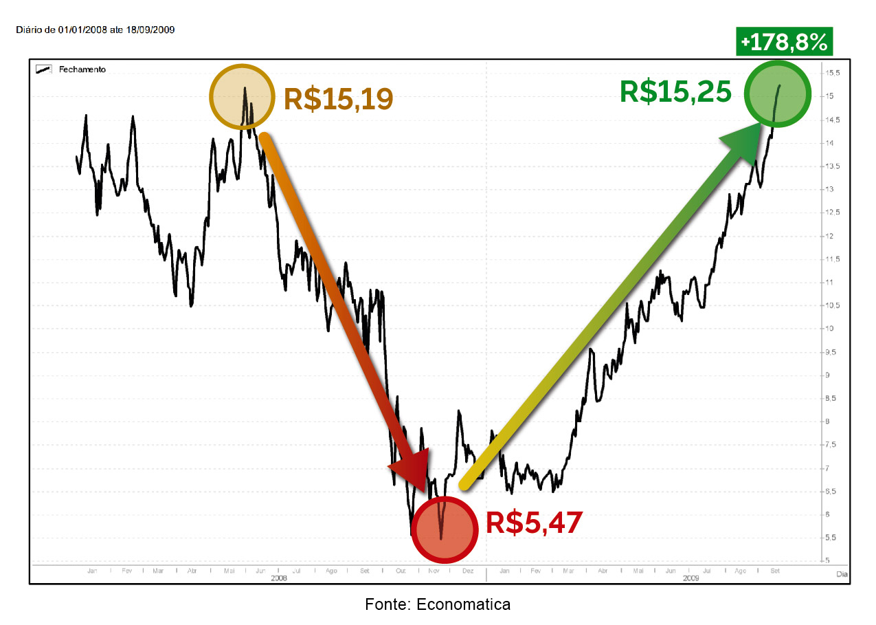 Em setembro de 2009, a ação já tinha recuperado o preço do topo, custando R$ 15,25.