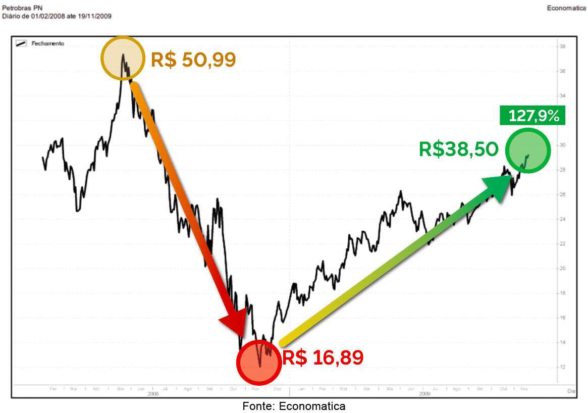Um ano depois, o preço foi para R$ 38,50, mais do que dobrando o investimento para quem comprou na queda.