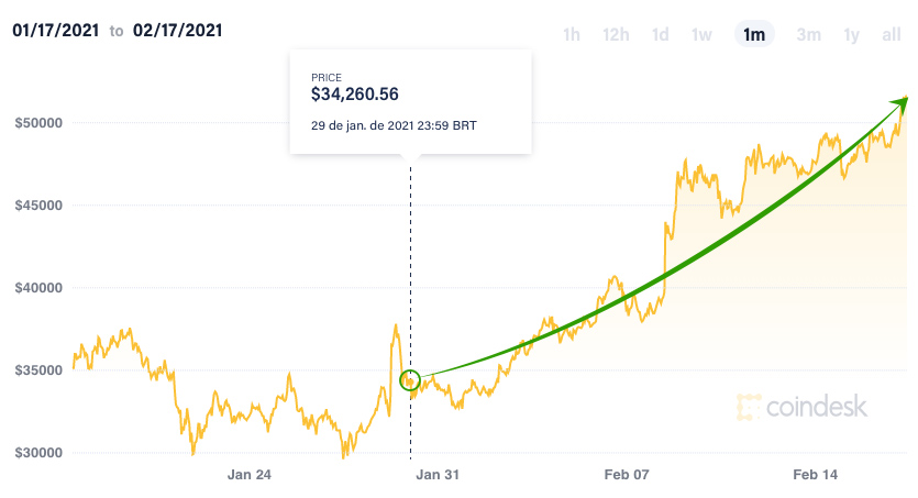 Desde que ele fez a postagem, no dia 29 de janeiro, o Bitcoin chegou a subir quase 50% em questão de dias.