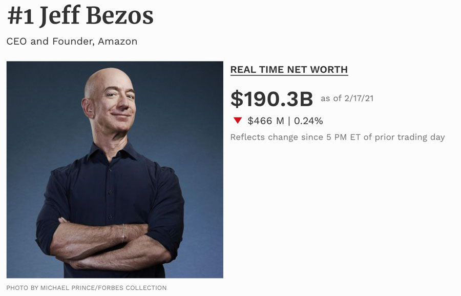 Segundo o último levantamento da revista, referente a 2020, a pessoa mais rica do mundo é Jeff Bezos, fundador da Amazon, com uma fortuna estimada em 190 bilhões de dólares.