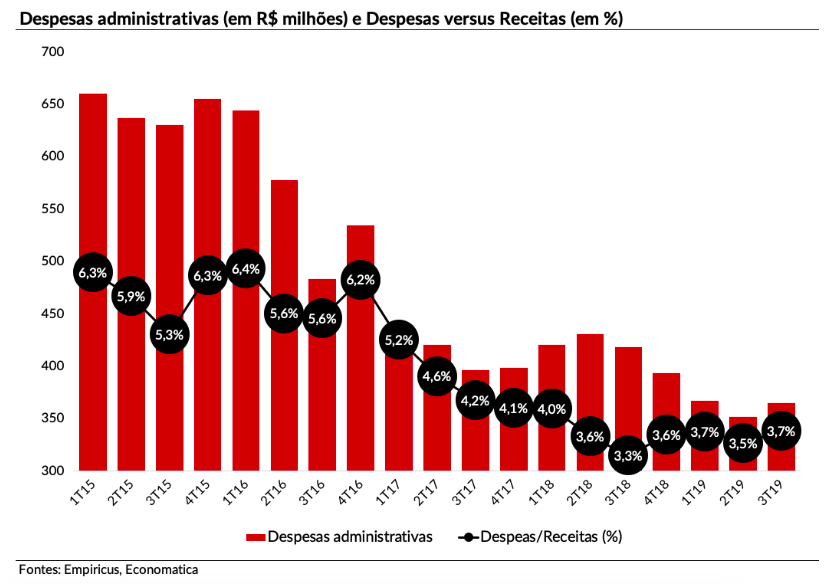 A companhia fez o dever de casa e reduziu de forma significativa as despesas administrativas, trazendo a relação entre despesas e receita ao menor nível da história.