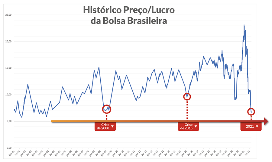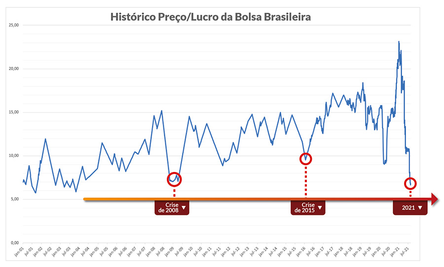 Ou seja, a Bolsa brasileira está mais barata agora do que nas últimas crises.