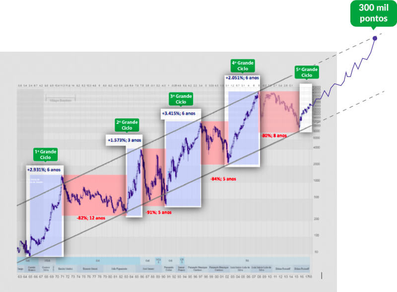 Os 4 primeiros grandes ciclos da Bolsa duraram entre 6 e 8 anos e entregaram multiplicações médias, ou seja, somente do Ibovespa, entre 5 e 21 vezes em real.