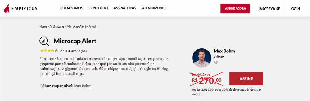 Como você pode verificar em nosso site, um ano de assinatura do Microcap Alert é vendido em 12 parcelas de R$ 270.