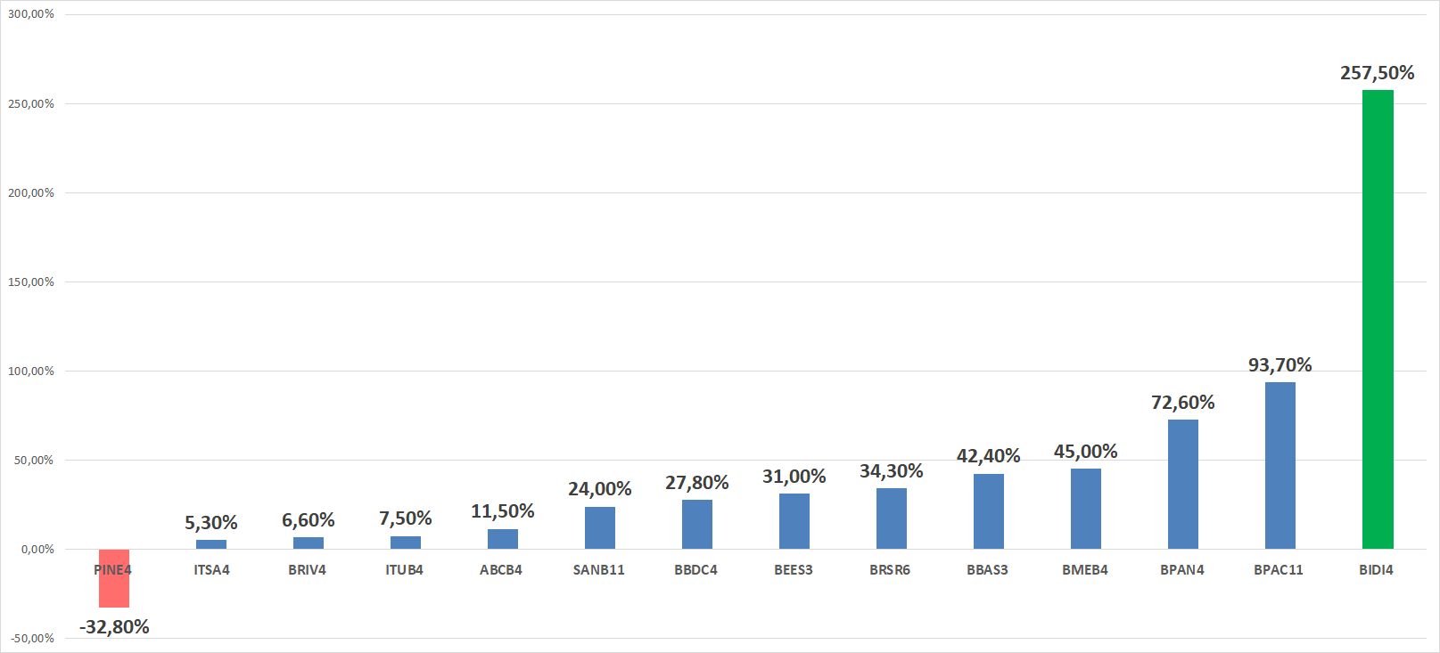 A barra azul do gráfico representa o Ibovespa, que rendeu +42,8% no período.