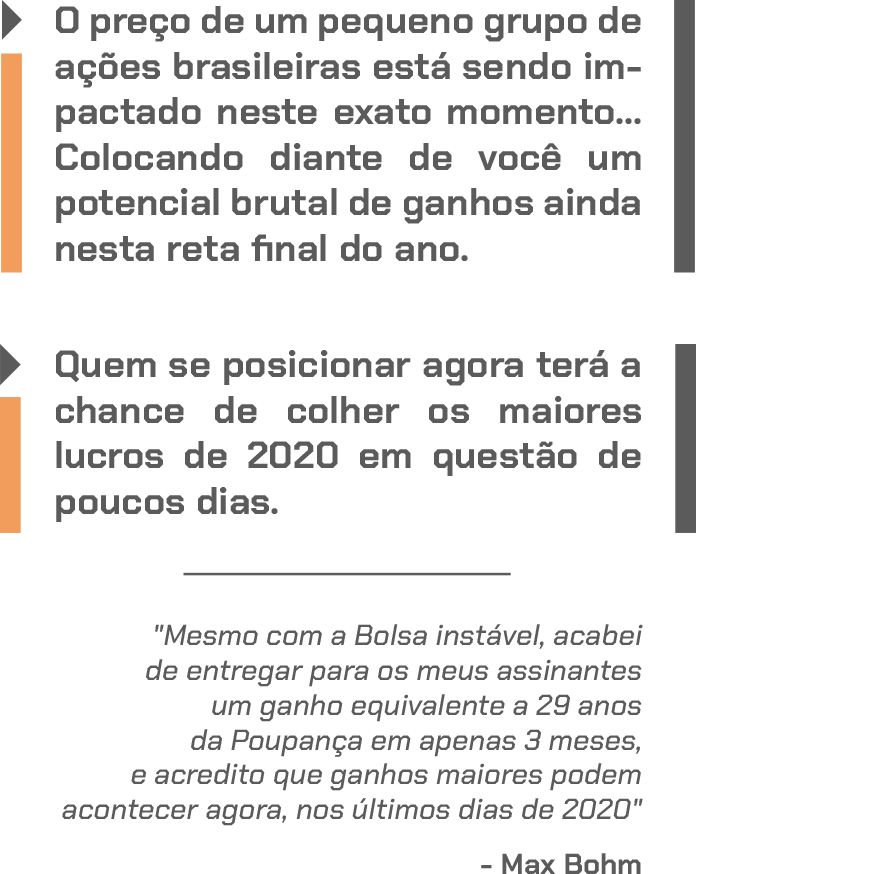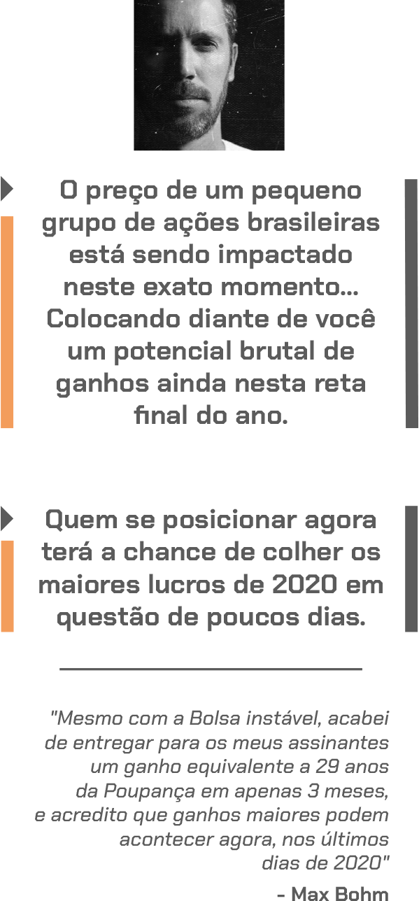 Apenas acredito que tenho em mãos ações capazes de aproveitar os gatilhos que foram detectados e entregar lucros muito expressivos já nesses últimos dias de 2020.