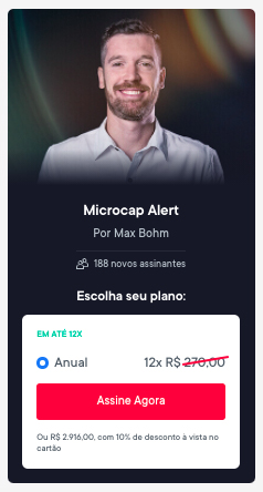 Em condições normais, a assinatura anual da série Microcap Alert custa 12x de R$ 270.