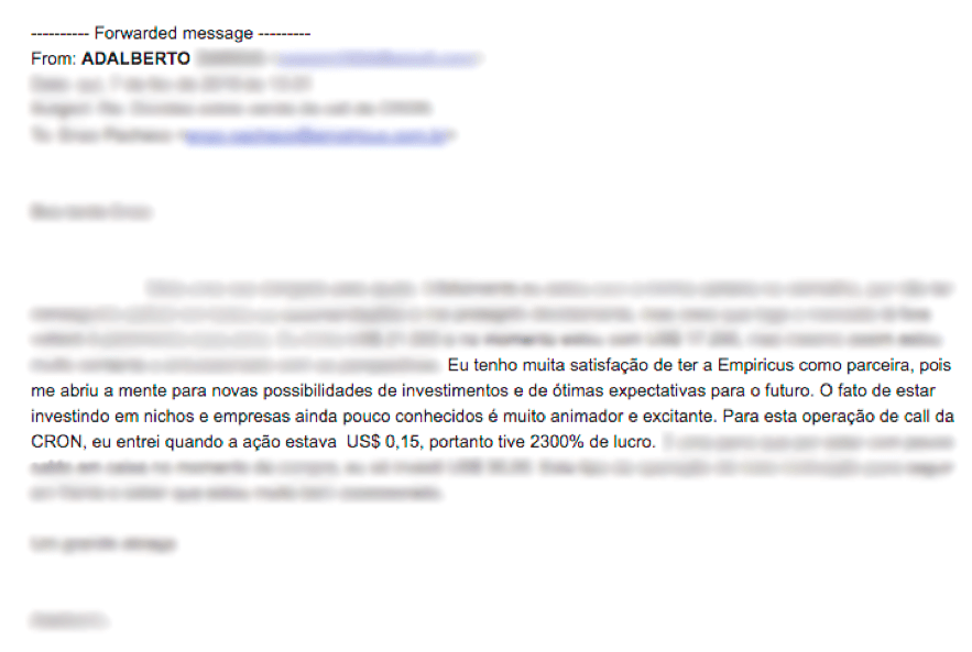 Os conteúdos da Empiricus visam informar sobre possibilidades de lucro financeiro sugeridas na forma de diferentes estratégias de investimento, eximindo-se a empresa de qualquer responsabilidade sobre eventuais prejuízos do assinante em decorrência da tomada de decisão deste. Embora a Empiricus forneça sugestões pontuais de investimento, fundamentadas pela avaliação criteriosa de especialistas certificados, não se pode antecipar o comportamento dos mercados com exatidão. Padrões, histórico e análise de retornos passados não garantem rentabilidade futura. Todo investimento financeiro, em maior ou menor grau, embute riscos que podem ser mitigados mas não eliminados. A Empiricus alerta para que nunca sejam alocados em renda variável aqueles recursos destinados a despesas imediatas ou de emergência, bem como valores que comprometam o patrimônio do assinante. A empresa não realiza intermediações financeiras, por conseguinte não obtém nenhum tipo de receita advinda de comissões, corretagens ou emolumentos sobre montantes aplicados, delegando ao investidor a exclusiva responsabilidade pela execução de operações junto à respectiva instituição financeira na qual possua conta aberta. Para assegurar a imparcialidade na avaliação dos investimentos, a Empiricus não recebe patrocínios nem veicula publicidade que não a de seus próprios conteúdos. Pessoas que têm dificuldades com limites devem procurar aplicações mais estáveis, como a renda fixa. A título de elevação dos padrões fiduciários e promoção das melhores práticas do mercado, os sócios da Empiricus têm, ou podem vir a ter, posições nos investimentos sugeridos. A empresa zela pelo direito de privacidade dos seus leitores. Quando necessário, seus dados pessoais são alterados com o objetivo de proteger as identidades. No entanto, o conteúdo dos depoimentos apresentados é sempre e garantidamente fidedigno. A presente nota não se sobrepõe à legislação e regulamentação vigentes.