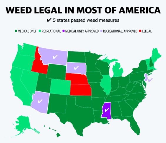Figura 2. Legalização da cannabis por estado americano: somente medicinal (verde escuro), recreativo (verde claro), somente medicinal aprovado na última eleição (roxo escuro), recreativo aprovado na última eleição (roxo claro) e ilegal (vermelho) | Fonte: Yahoo! Finance