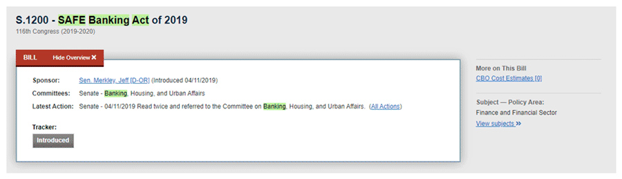 O primeiro é o SAFE Act (ligado à flexibilização bancária), e o segundo, o MORE Act (ligado à descriminalização da cannabis em nível federal).