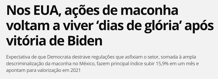 A Eleição de Joe Biden, a legalização do uso da maconha no México e a reclassificação da erva feita pela ONU fazem com que 2021 seja o ano em que as "Pot Stocks" possam gerar fortunas para alguns investidores.