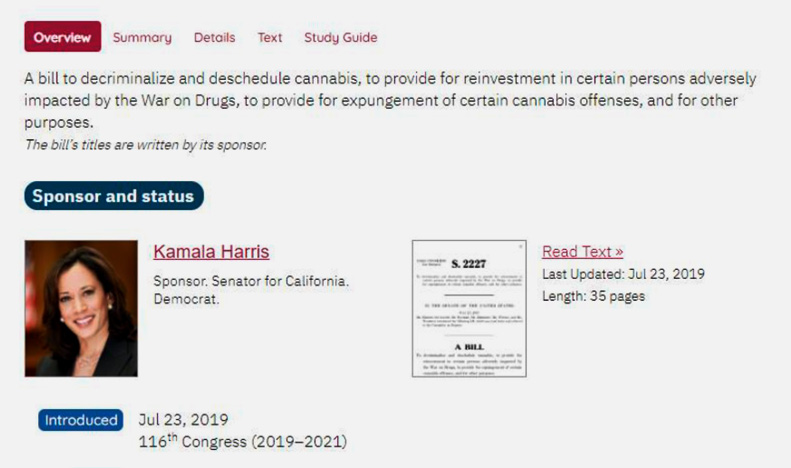 Sobre o MORE Act, a boa notícia é que a relatora dessa lei é a ex-senadora e atual vice-presidente Kamala Harris.