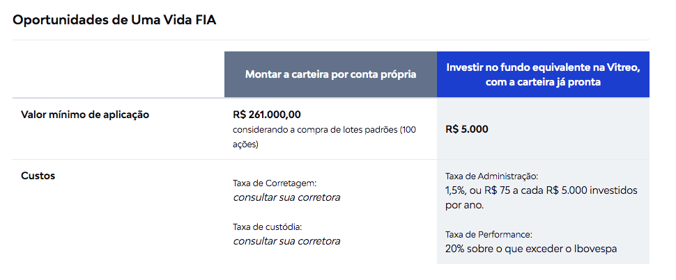E quanto preciso para investir no Vitreo Oportunidades de Uma Vida? Quais são as taxas?