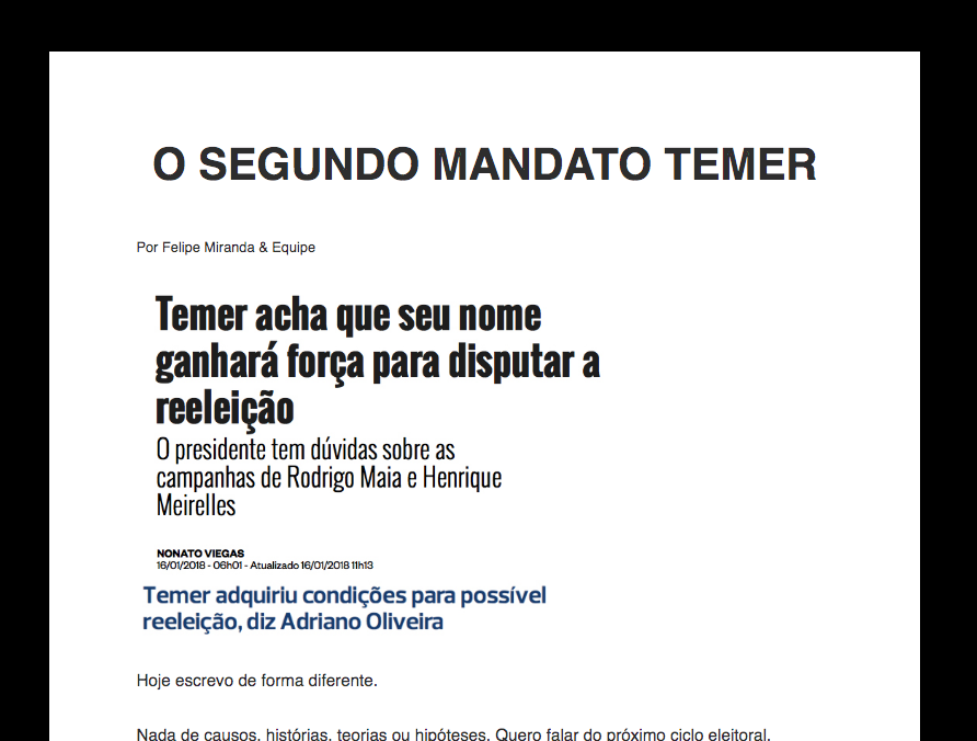 No começo de 2018, escrevi sobre O Segundo Mandato Temer. Não era algo pessoal, evidentemente. Em um momento de dúvida quanto aos rumos do Brasil, eu apenas propunha a imposição da agenda liberal como algo inexorável para o país.
