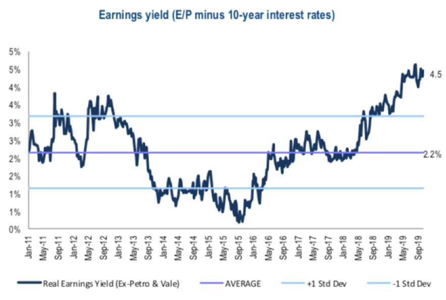 Note como o indicador está bem acima de um desvio padrão sobre sua média histórica desde 2011, de 2,2%, negociando a 4,5%. Nossa leitura é de que esse deslocamento se deu mais por taxa livre de risco estruturalmente mais baixa, e não por alta exacerbada dos lucros, que ainda está por acontecer, com crescimento econômico vindo finalmente em 2020 — a mediana das projeções estima mais de 2% de crescimento do PIB no ano que vem.