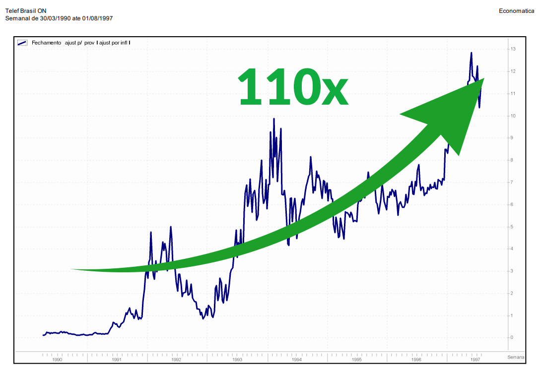 As ações de Telefônica Brasil, no ciclo de alta entre 90 e 97, se multiplicaram 110 vezes…
