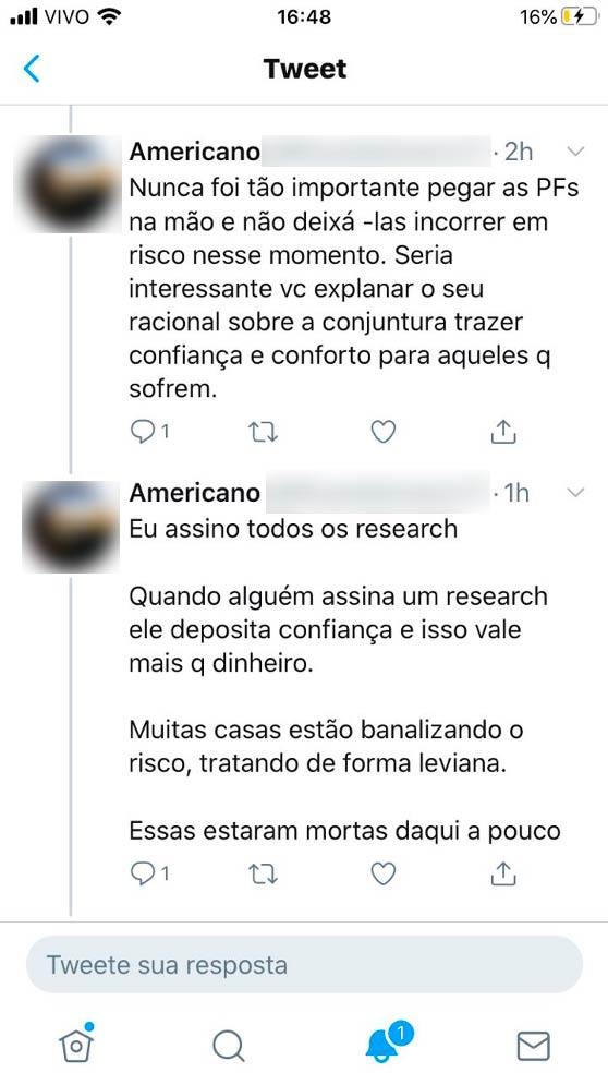 Temos abordado um a um dos nossos assinantes e recentemente rodamos uma pesquisa perguntando como eu posso te atender da melhor maneira possível, qual seria o nível de serviço 11 estrelas pra atender rigorosamente a todas as solicitações e você estar totalmente assistido, justamente em um momento, como você pode ver no relato que está aparecendo na sua tela, em que a pessoa física brasileira nunca precisou tanto ser "pega na mão" e conduzida com responsabilidade.