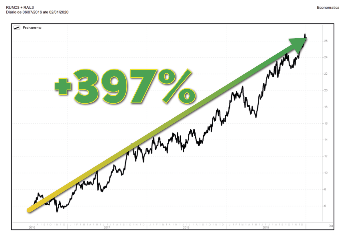 Mesmo assim, quem seguiu minhas indicações ali viu seu patrimônio se multiplicar duas vezes, três vezes, cinco vezes em alguns casos, como com as ações de Rumo, com +397% numa operação já fechada: