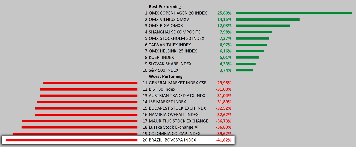 Se a gente isolar a avaliação aos índices de AÇÕES globais, em uma consulta a todo o acervo da Bloomberg, temos o Ibovespa, principal índice de ações do Brasil, como pior performance do mundo inteiro, caindo mais de 40% em dólares desde o início do ano.