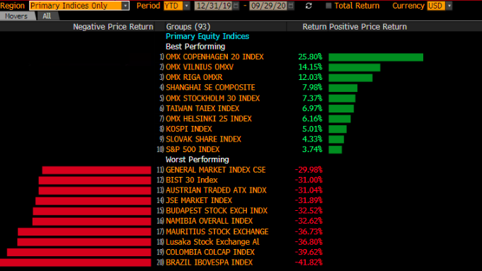 Como você pode ver, a Bolsa brasileira aparece atrás de mercados bastante exóticos, como da Namíbia e das ilhas Maurício, mesmo esses, também, com uma performance bastante negativa no acumulado do ano.