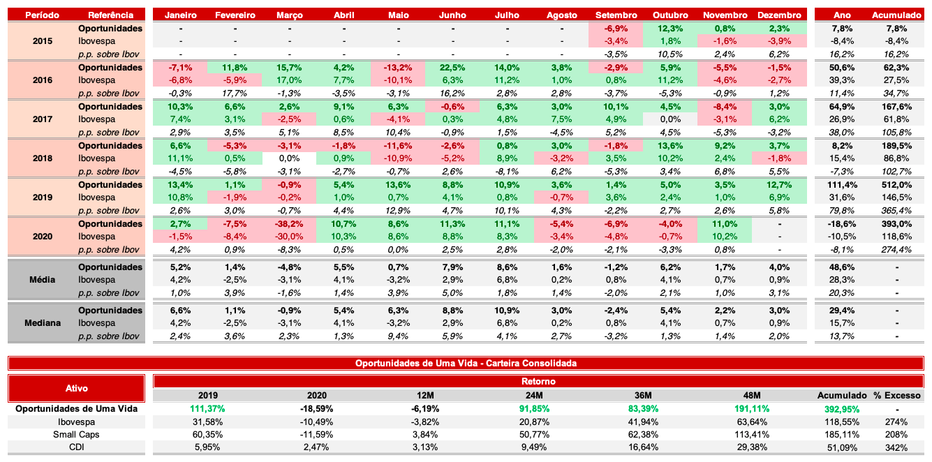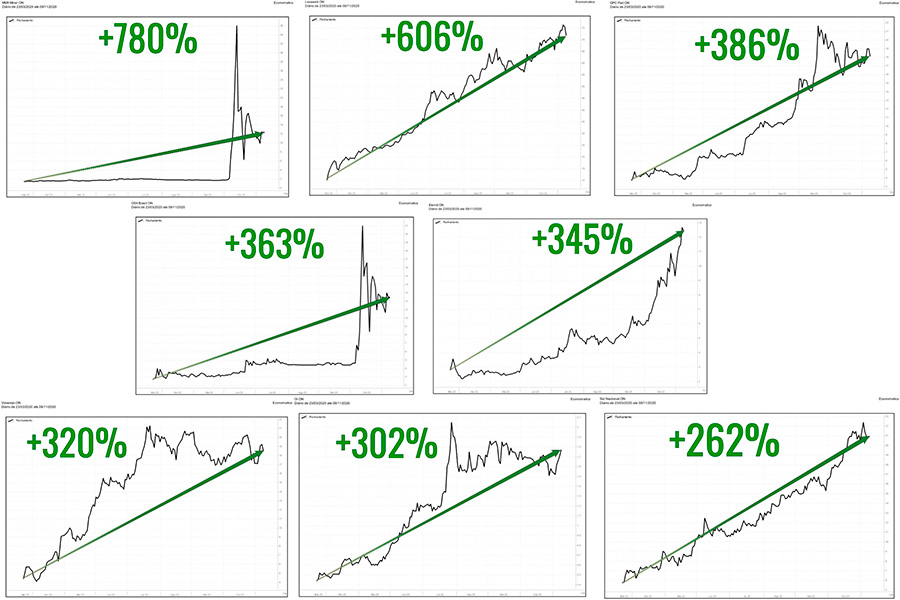 +392% de ganhos acumulados no período, multiplicando o capital dos leitores em 4,9 vezes.