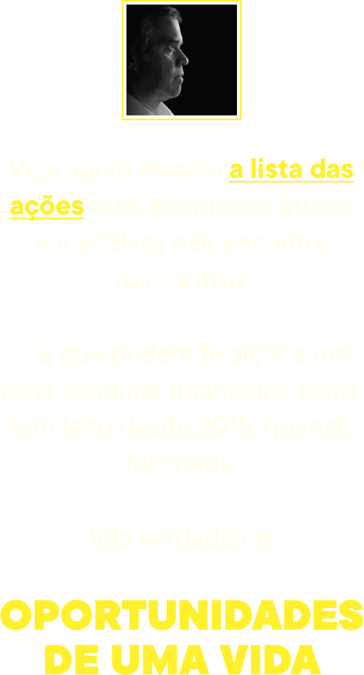 1. Eu vou abrir pra você a tese da Empiricus e você vai ver que precisa, o mais rápido possível, investir em ações ou aumentar sua posição. Também vou te mostrar como você pode acessar a Lista de ações Oportunidades de Uma Vida, do Felipe, sem assumir compromisso financeiro ALGUM conosco neste primeiro momento. Vamos abrir a lista, sem compromisso, você olha, nos conhece e decide depois se quer colocar um dinheiro nisso.