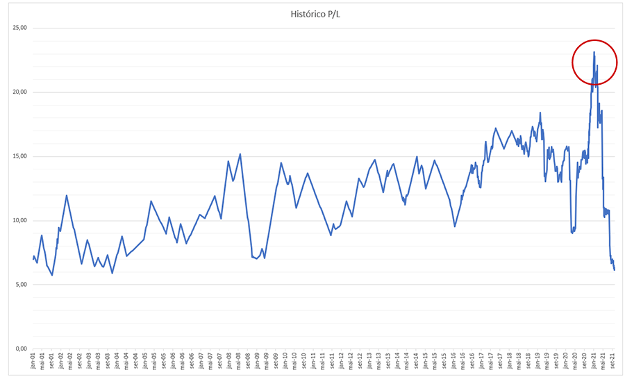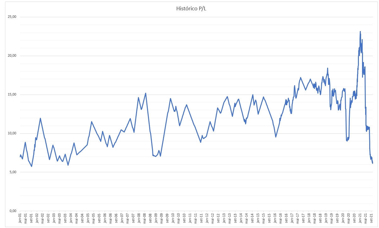 Esse é o múltiplo de Preço sobre Lucro da Bolsa brasileira. Eu arrisco dizer que é o gráfico mais importante para uma pessoa que pensa em ganhar dinheiro hoje.